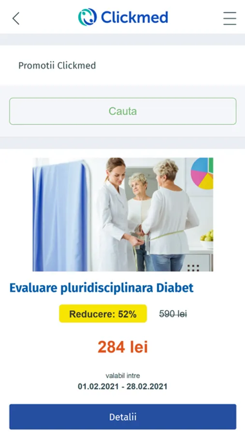 Vezi ofertele speciale de servicii in cadrul centrelor medicale partenere Clickmed. Astfel poti sa te ingrijesti de sanatatea ta beneficiind de pachete de sanatate avantajoase.