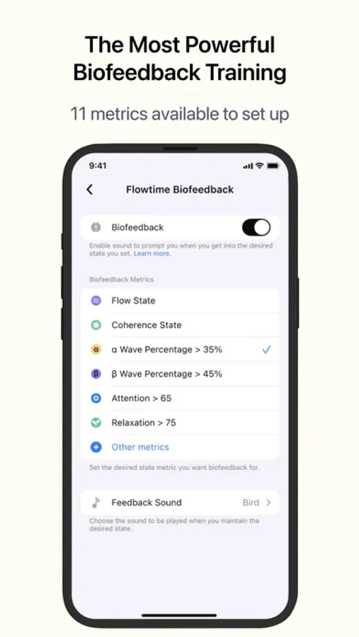 Know you're getting there as you hear the sound that verifies your desired state, whether it's flow, breath coherence, alpha or theta status, or focused concentration. No more guesswork or relying solely on feelings. There are 11 metrics available to set up.