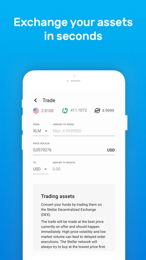 Trade Stellar assets on the DEX via the intuitive trading interface straight from the wallet.