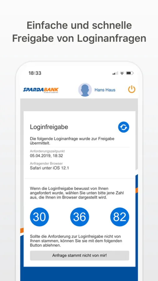• Alle Daten des zu zeichnenden Auftrages bzw der Loginfreigabe werden nochmals in der SPARDA ID-App zur Prüfung dargestellt und werden durch Anklicken der richtigen Kontrollzahl freigegeben