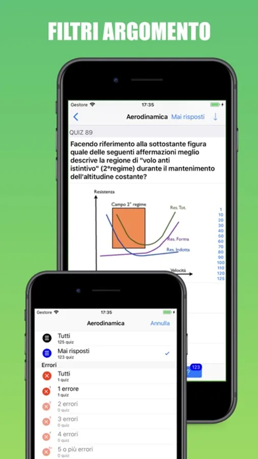 - Possibilità di visualizzare per ogni argomento i quiz mai risposti ed i quiz errati organizzati per numero di errori;