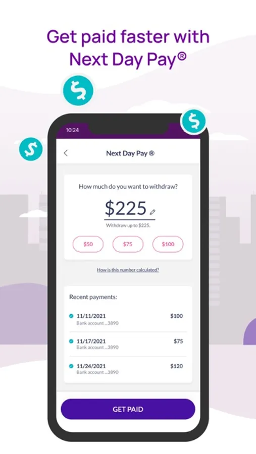 - Access our FREE Next Day Pay® service to get paid the next business day.