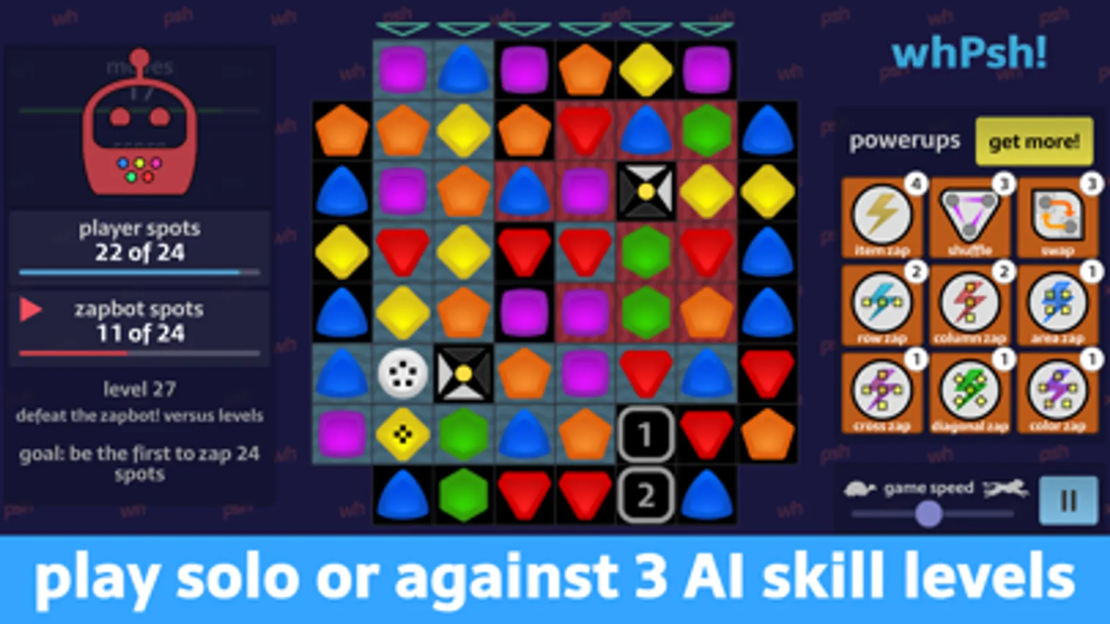 -- Play solo or try to defeat three AI skill levels in head-to-head competition.