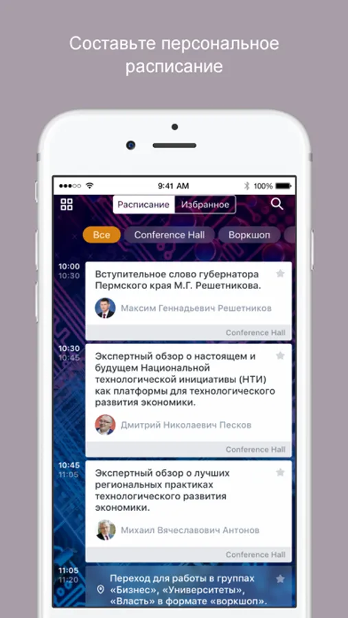 - составить собственную программу и получать оповещения о начале избранных докладов;