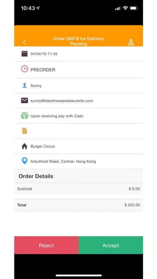After clicking on eth pending order, the system will display all relevant details concerning the order: Guest order details and delivery details.