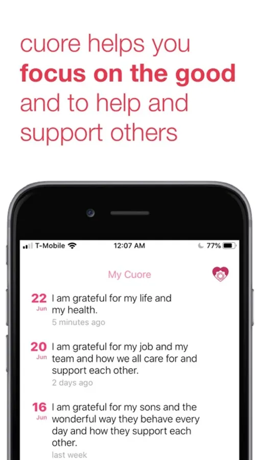 cuore is a simple way to grow and be happier by being thankful, to focus on the good things in your life and to help and support others like you.