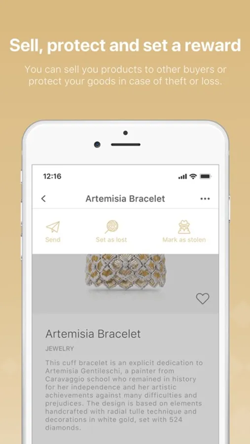 You can access your personal gallery of luxury goods, select your favorites and access the product sheet to find out the details, the origin, look at the manufacturer informations and see the previous owners.