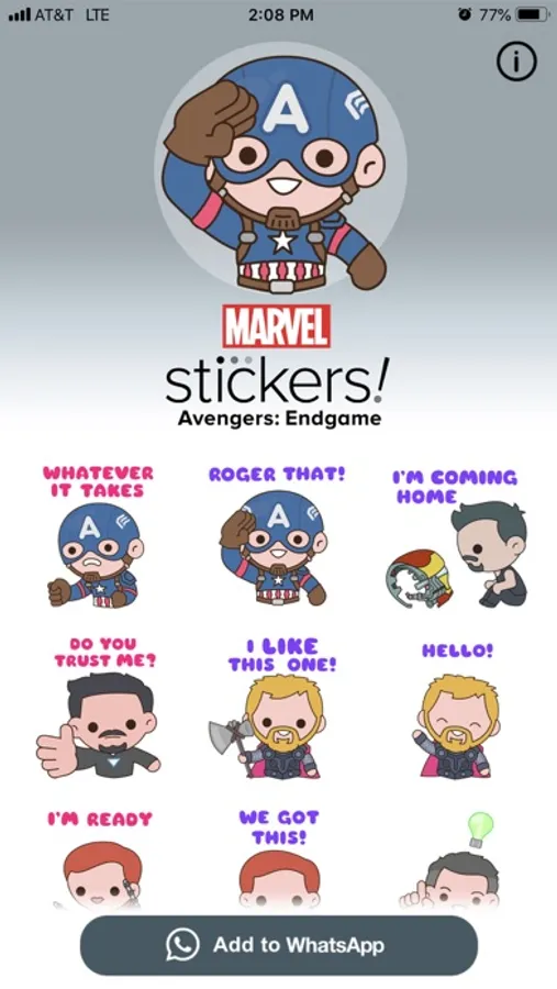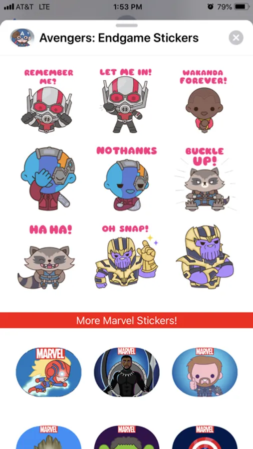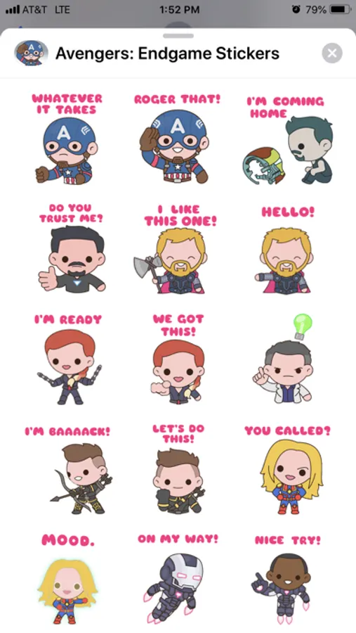 We’re in the Endgame now! Download this new pack of 24 Marvel Studios’ Avengers: Endgame animated stickers including Iron Man, Captain America, Thor, Black Widow, Hulk, Hawkeye, Captain Marvel, Ant-Man, Okoye, War Machine, Nebula, Rocket, and Thanos!