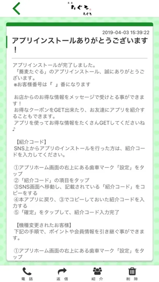 蕎麦たぐるのアプリをSNSを通じてお友達に紹介する事ができます。