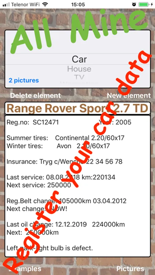 - All car data: reg. number, services, oil change, reg. belt change, tires ...