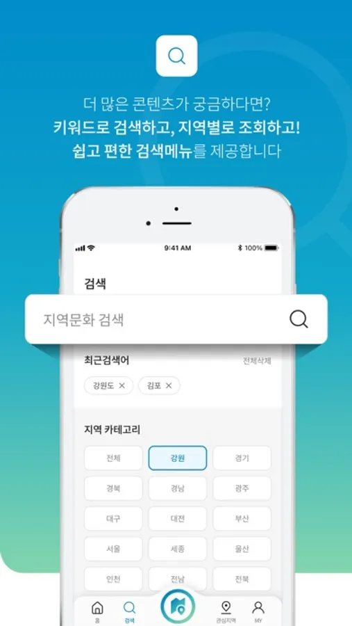 8) 검색어 자동완성, 최근검색어, 인기검색어 기능과 지역문화 지도를 포함한 통합검색 기능 제공