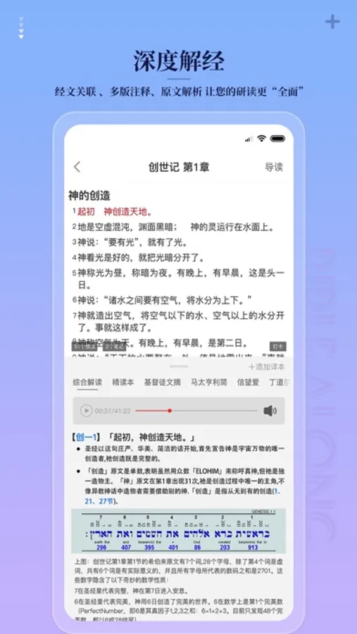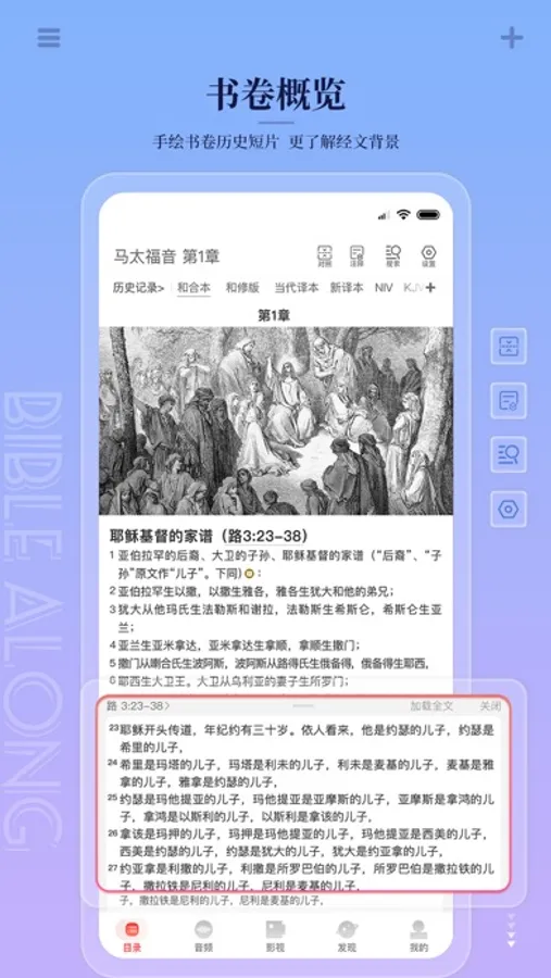 The main Bible APP is a fully functional and simple Bible reading APP. The common version of the software supports the collection of notes and other assistance tools. At the same time, it also provides the scripture checking team. The scripture checking team can punch in and interact with many people to check the scriptures. The team leader can comment on the punch in information. For the user's individual spiritual practice software, it sets the plan of reading/reciting the bible, writes the spiritual practice log, and views spiritual books