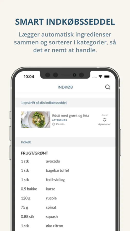 • Smart indkøbsseddel, som lægger ingredienserne sammen og sortere dem i kategori. Klik det væk du har i forvejen, for at få en overskuelig og nem indkøbsseddel, som hjælper til både at spare penge og undgå madspild.