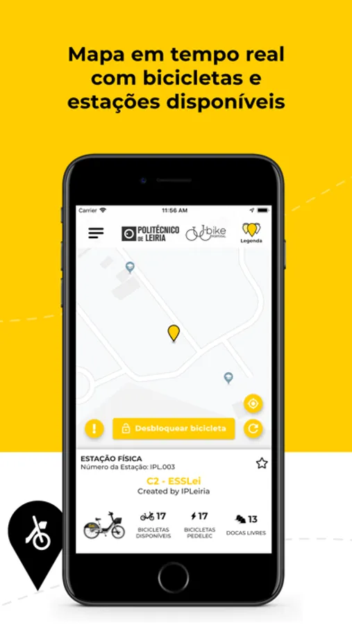 A aplicação oficial do sistema de partilha de bicicletas do Politécnico de Leiria é a forma mais fácil de usar as bicicletas e pedalar pelas Regiões de Leiria e Oeste. Pode ver quantas bicicletas estão disponíveis em cada estação, aceder ao seu perfil e ver o seu histórico de viagens. Pode até desbloquear as bicicletas com esta aplicação!