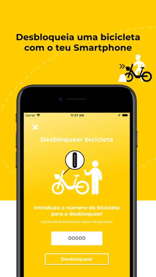 Use a aplicação móvel para desbloquear a bicicleta. Inicie sessão no seu telemóvel e introduza o número da sua bicicleta. O número esta localizado na coluna do guiador.