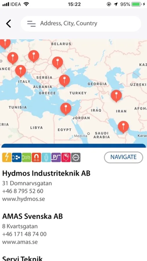 The locator helps to find the closest dealers and Dynaset service points. It is designed to work with the GPS information from user’s device. It shows the users location and lists the closest dealers near to the signal. With clicking from the list one can select the dealer and hit the navigate button on the right to get the route information. The navigating will be directed to and done by third party apps such as Google Maps provided by the device.