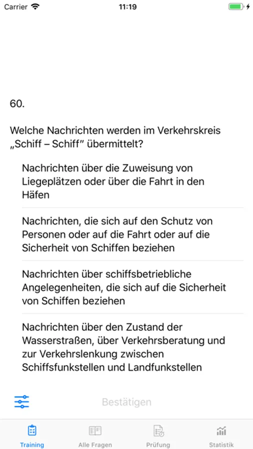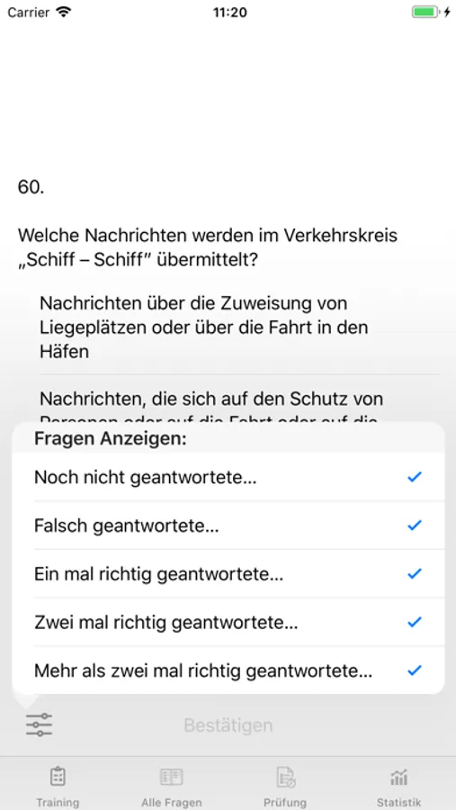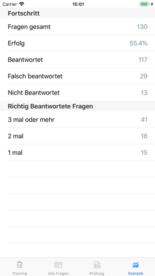- Auswahl der Trainingsfragen nach Lernfortschritt somit die Möglichkeit sich auf die Fragen zu konzentrieren wo man Schwierigkeiten hat