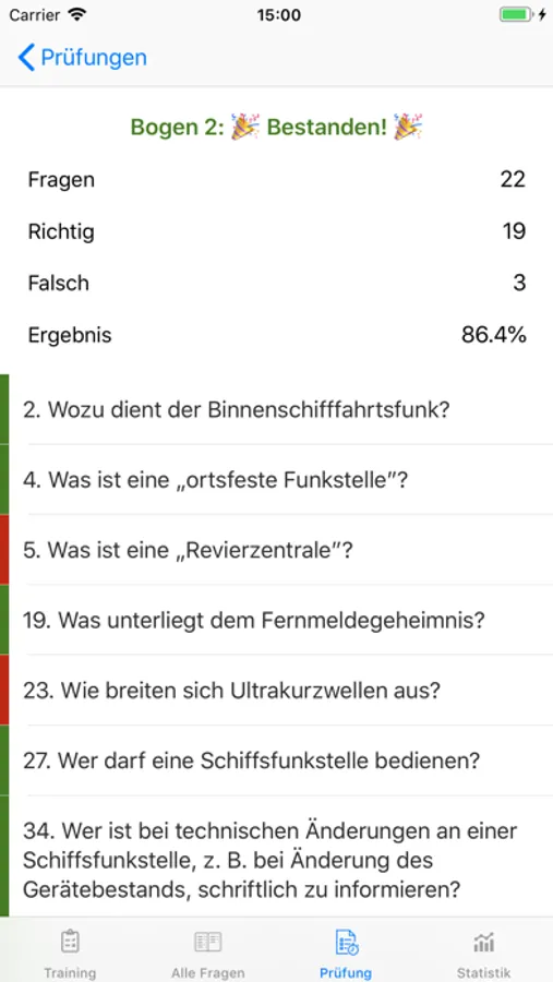 - Realistischer Prüfungsmodus mit allen 12 amtlichen Fragebögen