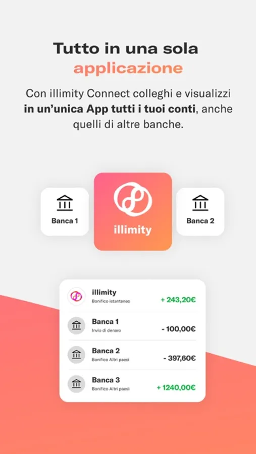 - illimity Connect per collegare e visualizzare in un unico punto tutte le tue banche e fare bonifici da ogni tuo conto senza mai lasciare l’app illimity;