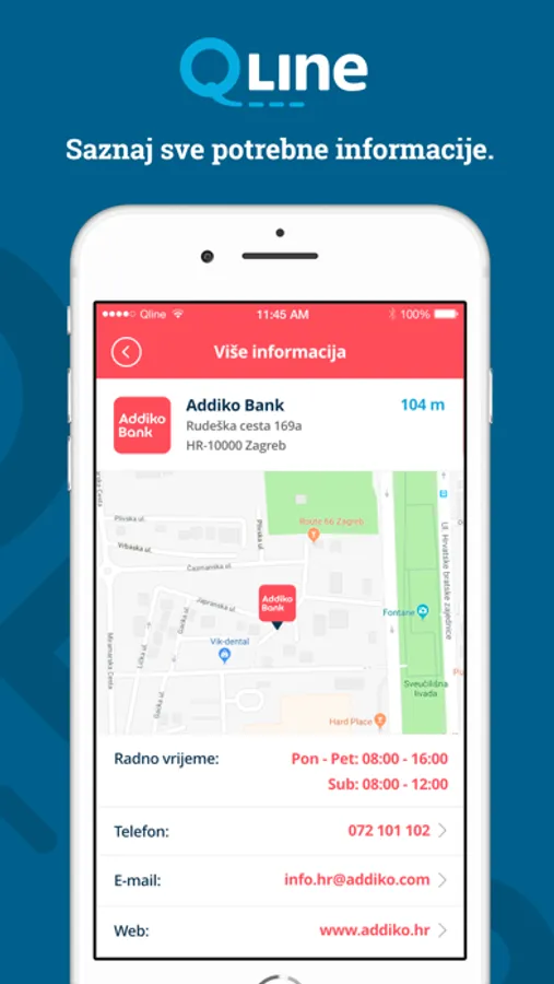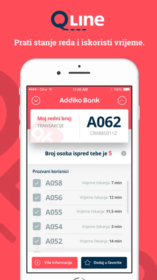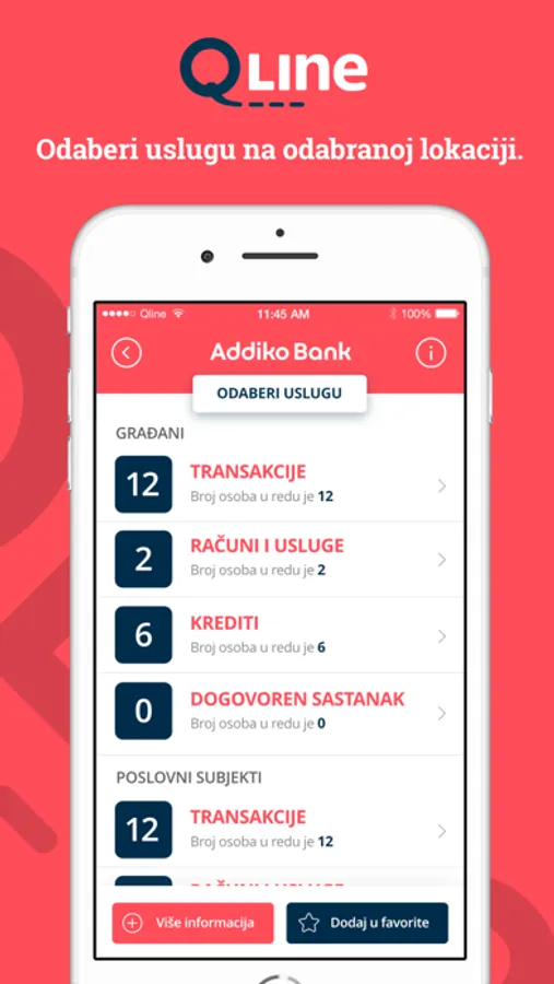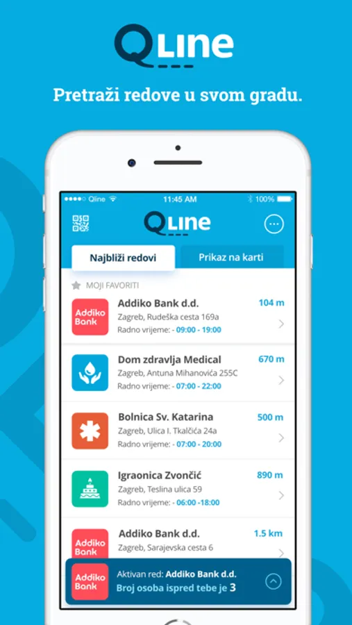 QLine je mobilna aplikacija koja Vam pomaže bolje organizirati i uštedjeti vrijeme. Ako idete u banku, kod liječnika ili vodite dijete u igraonicu, pogledajte koliko ljudi je trenutno u redu i uzmite svoj broj dok ste još kod kuće ili na putu prema odredištu.