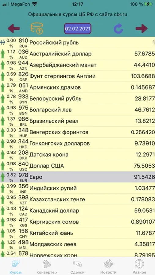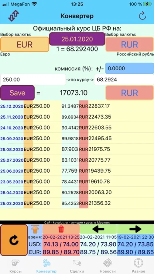 This application was created for the convenience of tracking the exchange rates of the Central Bank of the Russian Federation for the selected dates and is used as a transaction calculator for the automatic calculation of commissions (plus transactions and minus transactions) and totals. Plus, all this can be saved in the application's memory.