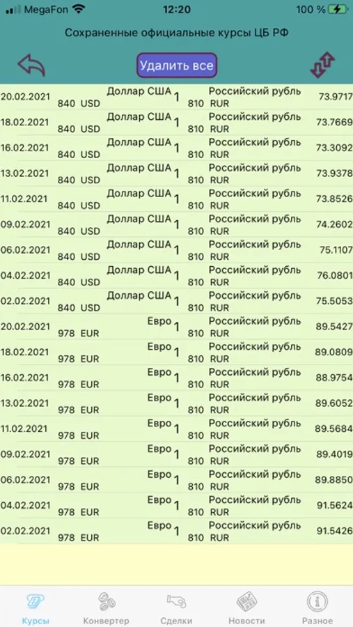 As mentioned above, the application has the ability to view the rates of the Central Bank of the Russian Federation for the selected date and save the currency rates you need in a separate table for ease of use. For example, it is convenient for an accountant to have before his eyes the rate of one or several currencies at once for several days for the most optimal calculation of the exchange rate difference. At the same time, in the Currency Converter, the same opportunity is implemented already with conversion into specific amounts. The most favorable days are immediately visible. All this is stored in the application memory.