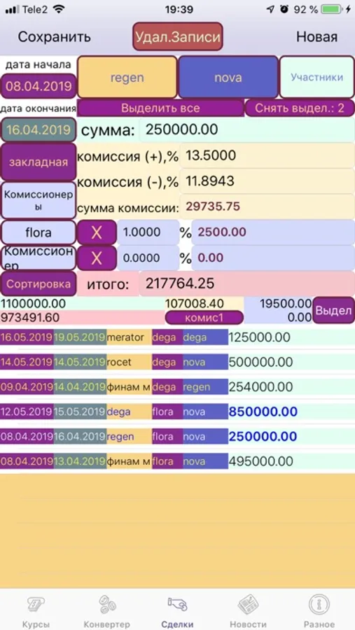 It is possible to sort the array of transactions by different fields - for example, by start or end dates of the operation, sort by buyers / sellers, and others. It is possible to summarize for several transactions, for example, what amount of commissions is due to a certain commission agent for several selected transactions at once.