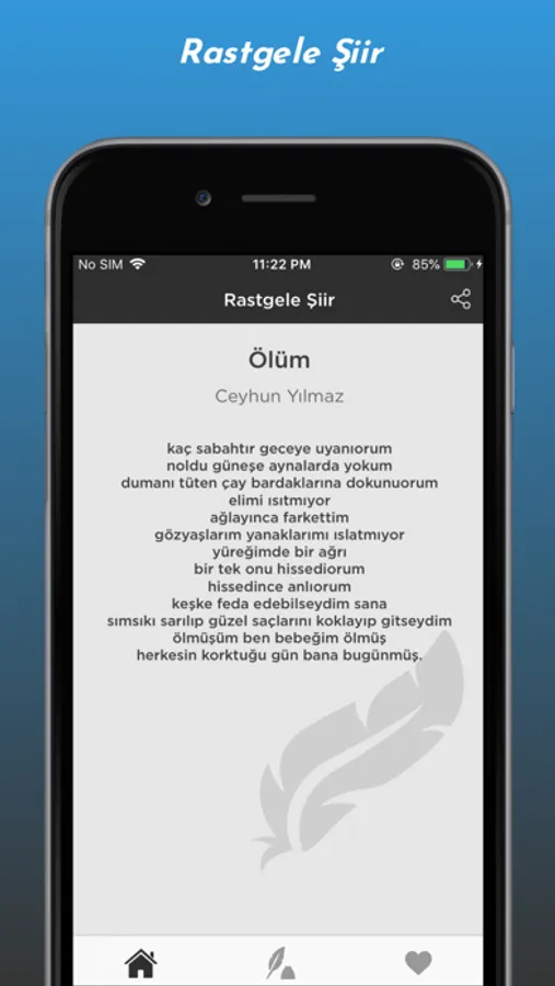 Uygulamayı yükleyerek her gün istediğiniz kadar şiir bildirimi alın. Sevdiğiniz şiirleri favoriye ekleyin. Rastgele şiir seçeneği ile bilmediğiniz şiirleri keşfedin.
