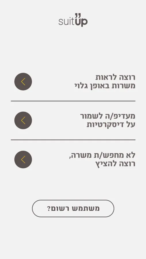 SuitUp Office מתאימה לך משרות לפי הכישורים והדרישות שלך והכל בקלות ובמהירות באמצעות טכנולוגיה ייחודית