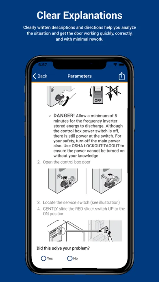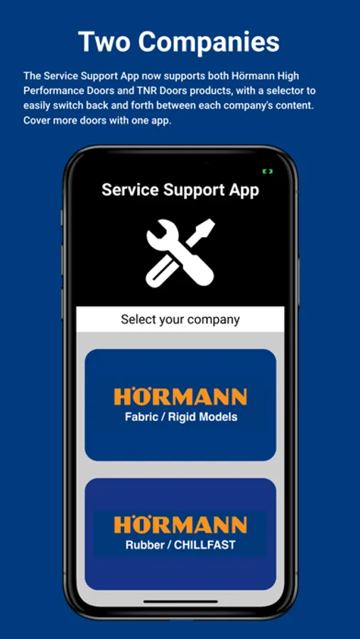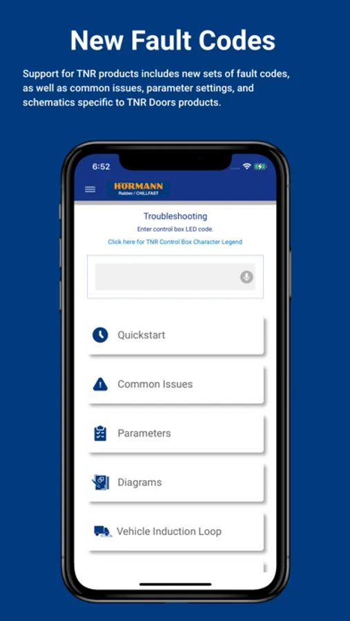 The Hörmann High Performance Doors/TNR Doors Service Support app provides trained Hörmann and TNR commercial door installers and service professionals with helpful installation and troubleshooting information, including searchable fault codes, parameter codes, quick start tips, common issues, schematics, and diagrams. It also provides quick access to online manuals and the help desk, all at the tips of your fingers.