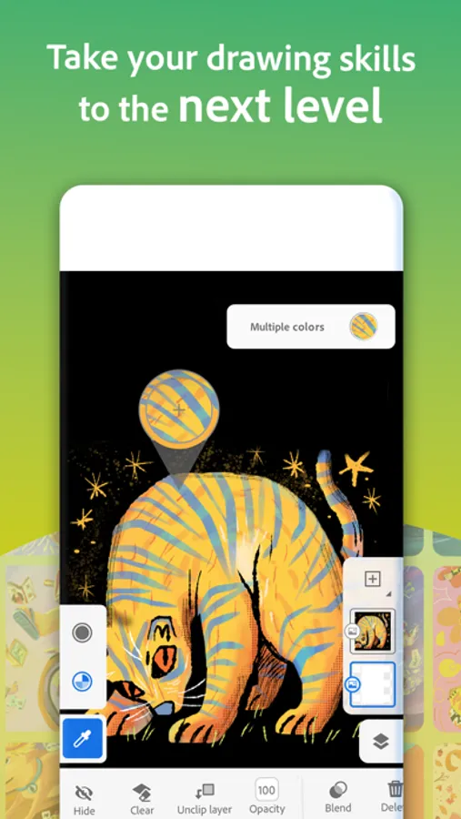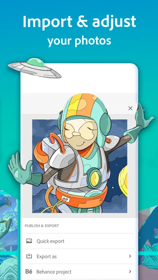 • Seamless integration with Photoshop and Illustrator — Open documents in either app without importing or exporting. Send your layered vector illustrations directly to Illustrator for desktop or iPad for those finishing touches.