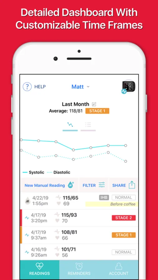 •Detailed dashboard with filtering allows you to customize your profile so you can monitor your readingsthrough easy-to-decipher charts and information.