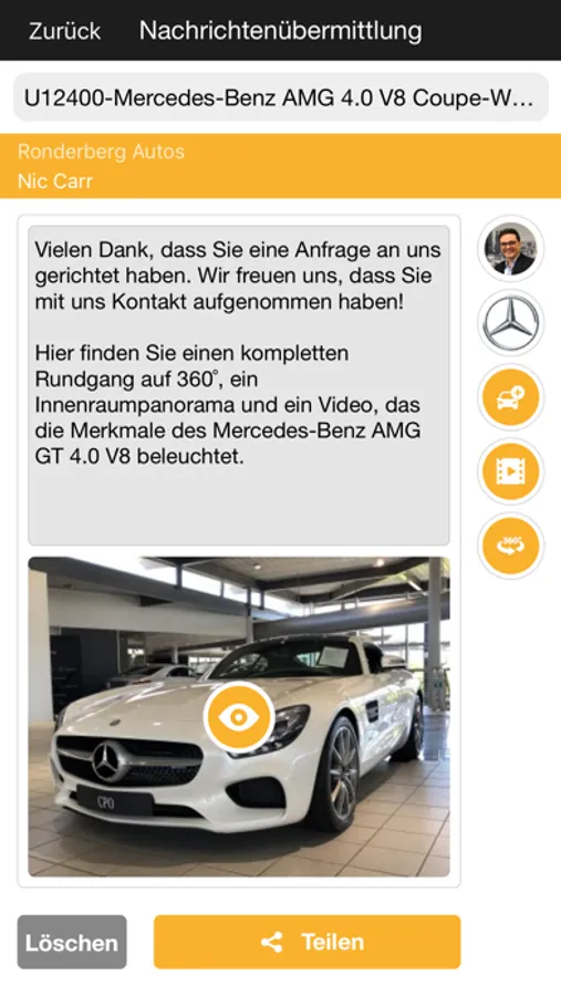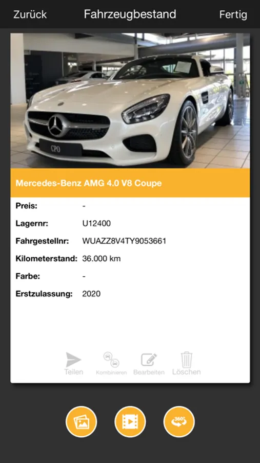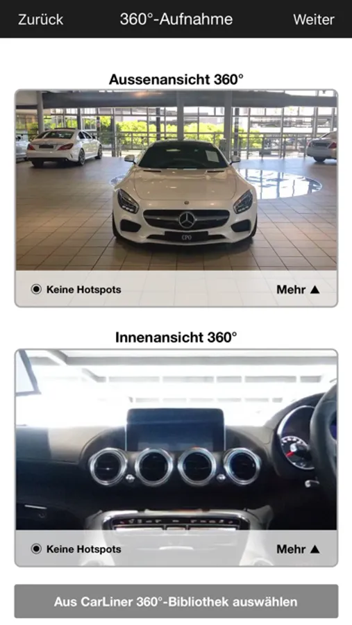 Eine interaktive 360°-Aufnahme ist innerhalb von nur 2 Minuten erstellt und kann – sofern gewünscht – noch mit Details versehen werden. Anschließend wird die 360°-Aufnahme von der App aufbereitet und mit dem betreffenden Fahrzeug verknüpft.