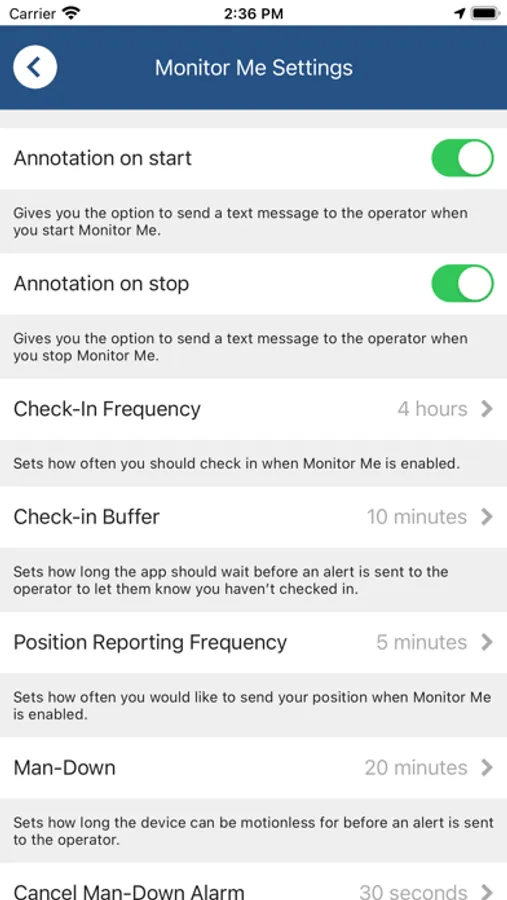 - HELP: alert with acknowledgement that “pings” your location to our Emergency Centre integration with 24/7/365 monitoring services and responders.