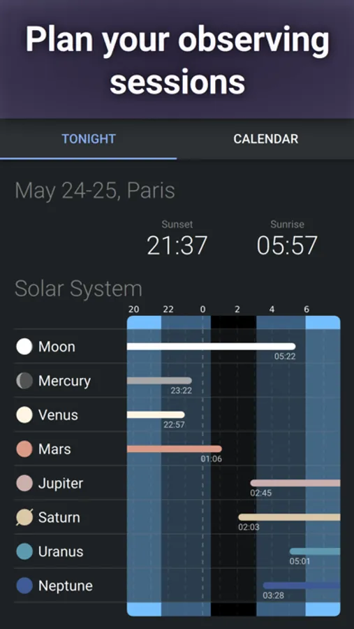 • Prepare your observing sessions using the advanced observation tools, to predict a celestial object observability and transit times.
