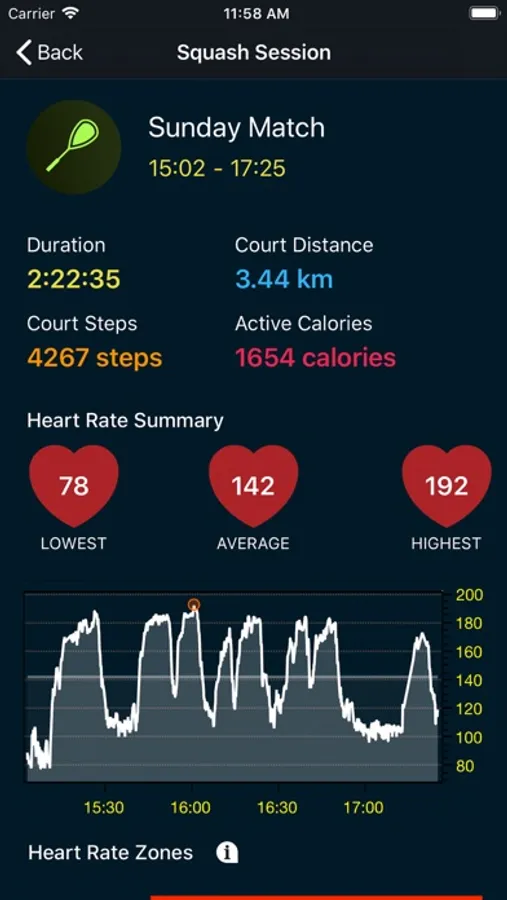 All the extra information collected can be reviewed in the Squash TrackR iphone app: