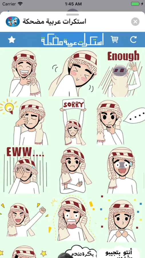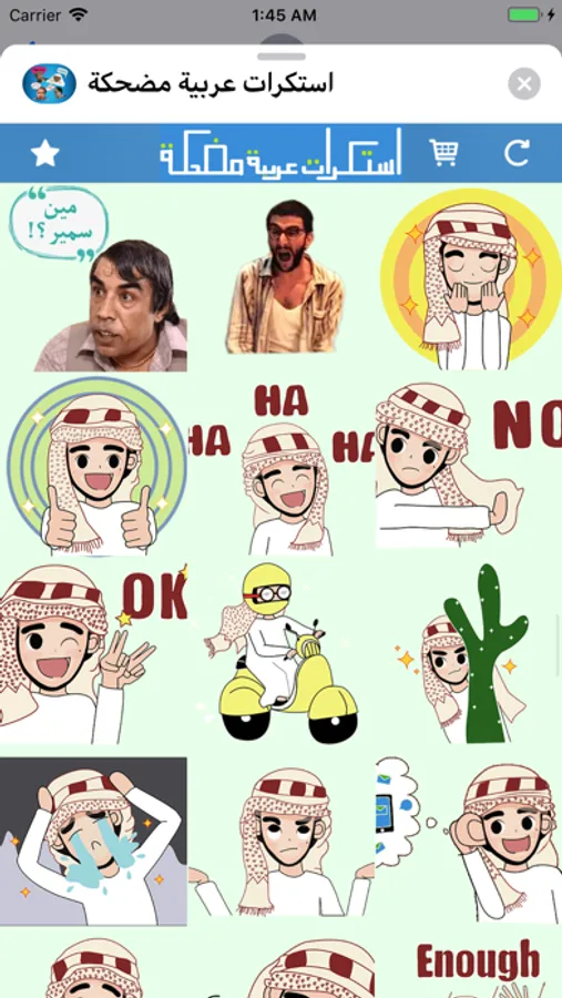 يحتوي على اكثر من 170 استكر بطابع عربي و خليجي. سيتم إضافة المزيد من الملصقات الخليجية و العربية المضحكة في التحديثات المقبلة