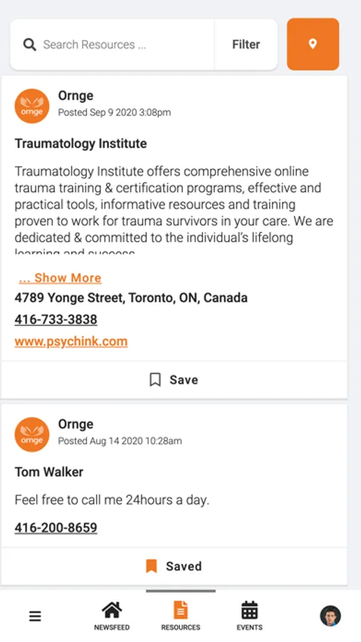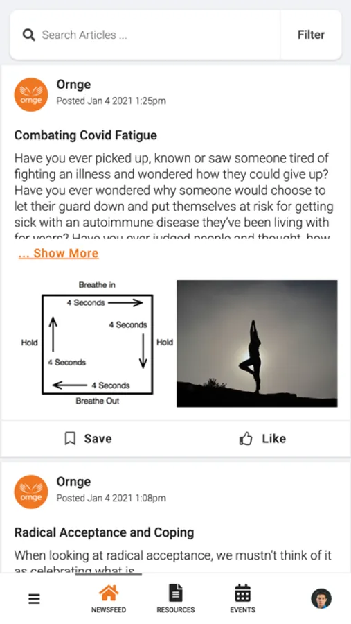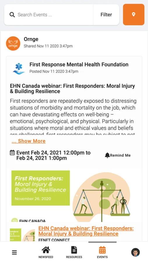 Ornge PeerConnect users have access to newsfeed articles, resources, and events related to mental health, wellness, culture, and belonging.