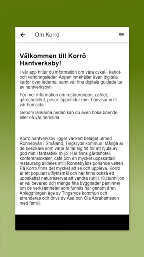 I vår app hittar du en digital guide över Korrös kulturbyggnader, vandringsleder, cykelleder och kanotleder. Med vår inbyggda QR-läsare får du snabbt och enkelt mer information om de olika sevärdheterna när du är plats.