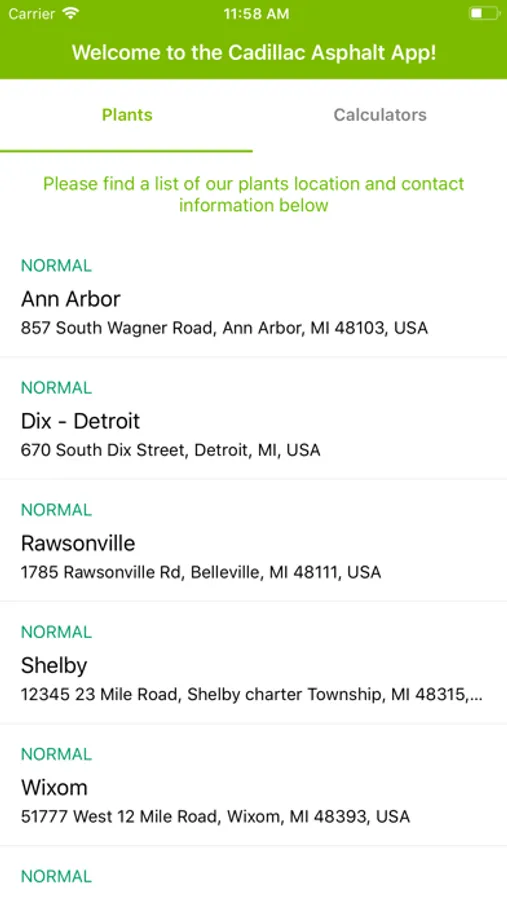 The Cadillac Asphalt Location Status App will provide you the most up to date information for our locations. In addition to our calculators to help you determine how much asphalt and aggregate you'll need, our In App notifications will provide you real time plant information so you are kept up to date.