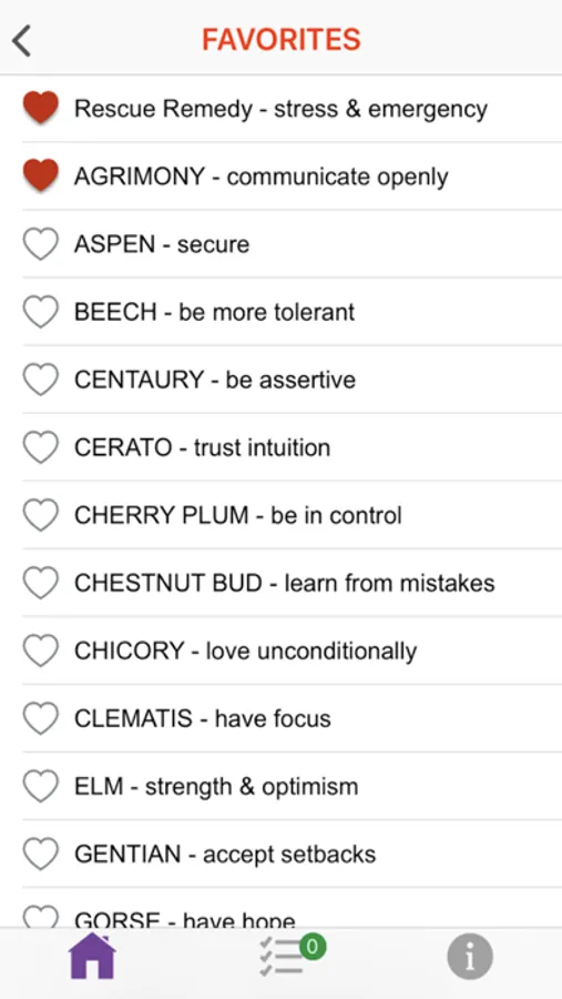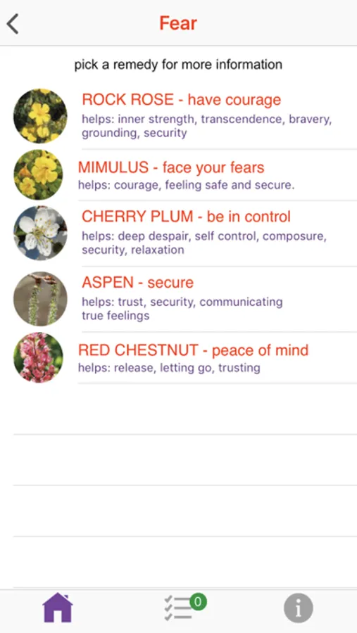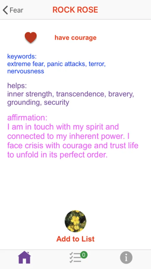 The Emotion path provides 7 emotional categories. Choosing one will open your way to several specific flower remedies. Helpful words are provided below the remedy name to help pick a remedy. Doing so leads to detailed information where you can make it a favorite, practice the affirmation (scrolling if needed to read more), add to your shopping list, or go back to choose another.