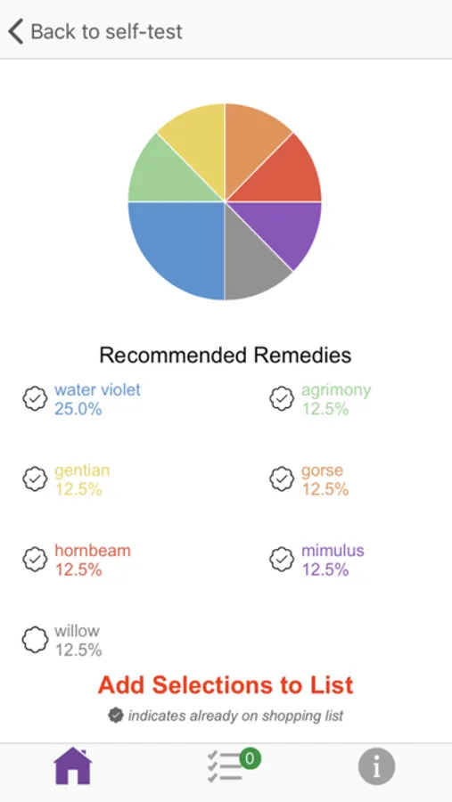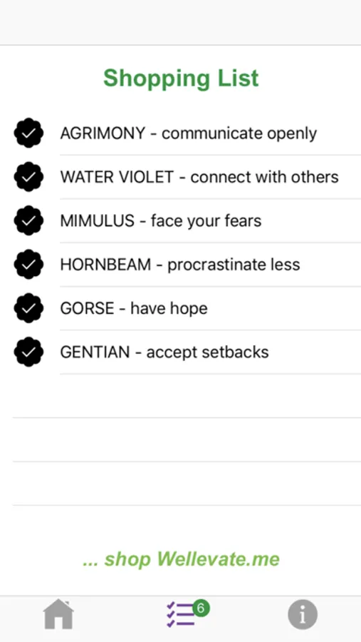 You can review remedies on your shopping list by selecting the list icon, in the middle of the tab bar. The number in the small green circle indicates the number of remedies added on your list. Added remedies, indicated by a checkmark symbol, included here.