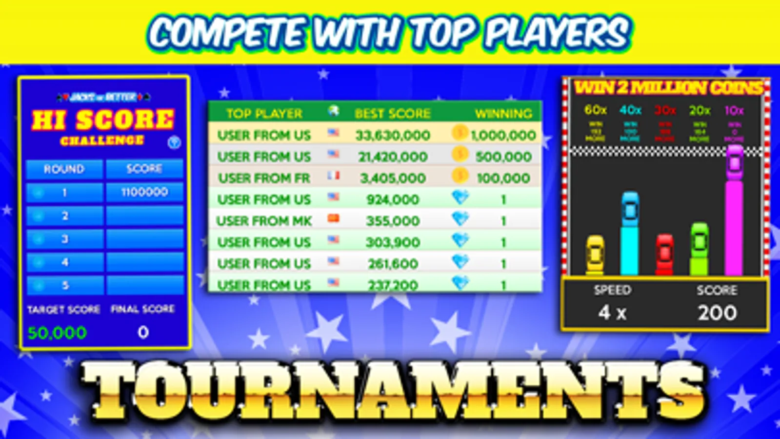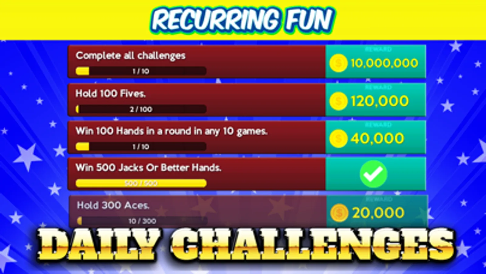 Compete with players from around the world in daily leaderboard events for each of the 48 poker machines and the Video Bingo game. Earn diamonds for every new score you post, and use them to spin the Fortune Wheel for a chance to win up to 5 million coins. Complete daily challenges for even more diamonds, which can be used to purchase extra balls in Video Bingo for a greater chance of winning.