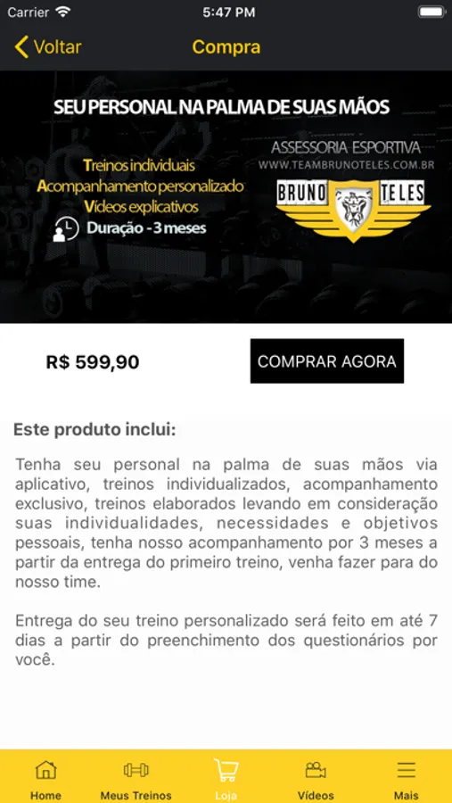 O aplicativo Bruno Teles Personal foi criado para deixar mais dinâmica a comunicação entre o personal Bruno Teles e seus alunos. A entrega de treinos e assessorias online são feitas diretamente através do aplicativo com a integração de questionários de anamnese para que o treino seja feito de maneira individual e personalizada.