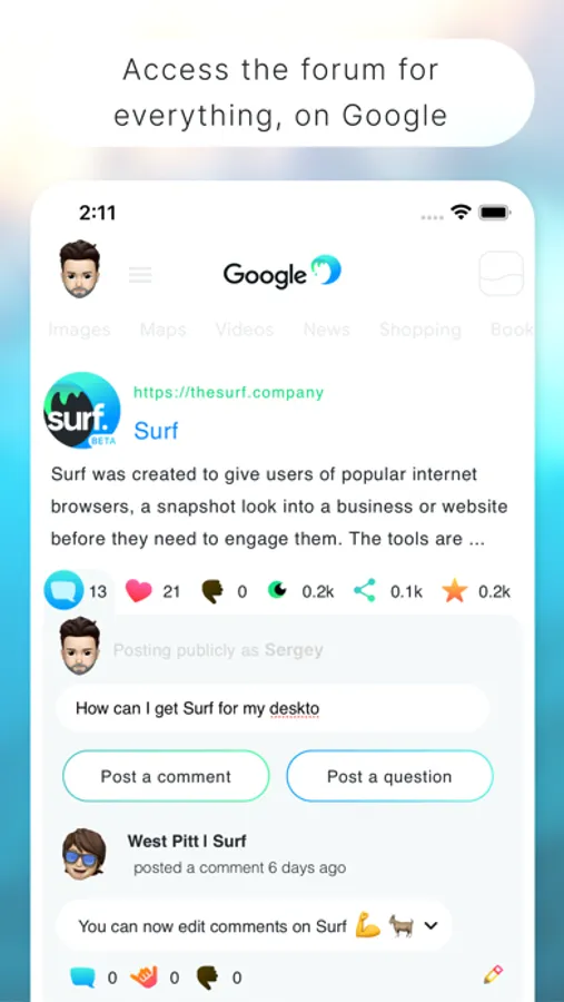 Now users can see and add views, comments, likes or dislikes, given by Surf users; It's like one big forum where users tell businesses how they feel and businesses, in turn, use the tools we provide to enhance business and their relationships with their users.