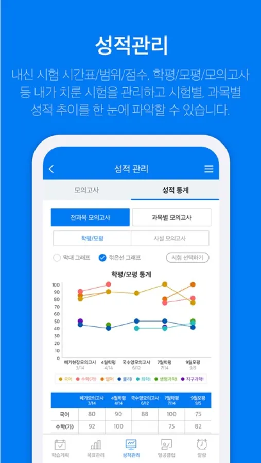 메가스터디 채점서비스와 연동되어 시험별/과목별 성적 흐름을 확인할 수 있으며,