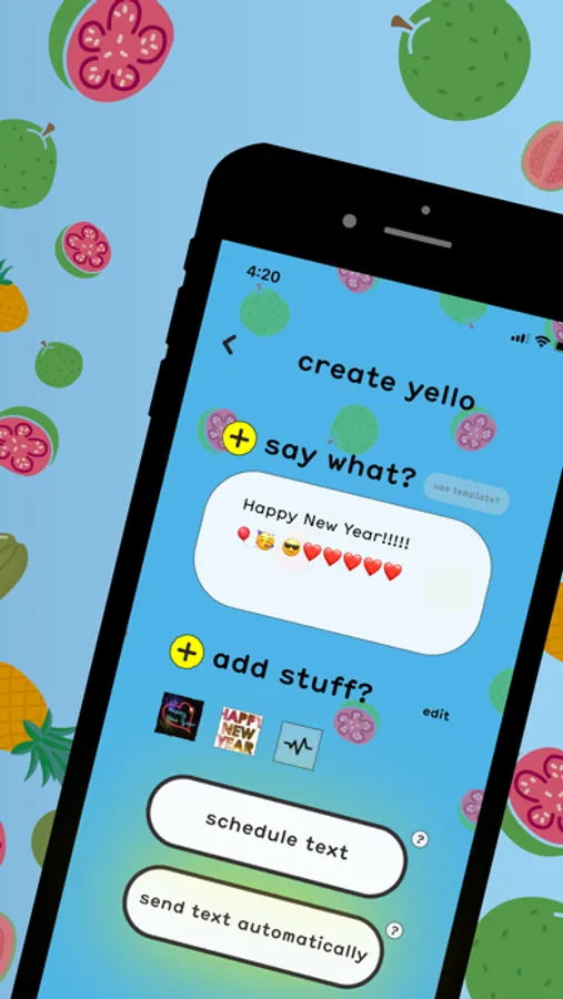 Apple writes, "Scheduling texts with Yello couldn't be simpler. Enter a phone number and a quick message, pepper in a GIF or two, and you're done!