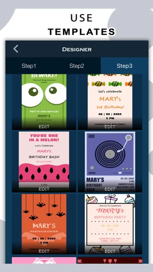 Hand Crafted pre-build Templates to create custom invitation cards. Just select invitation card design you like, edit information about the event and your invitation card is ready to share.