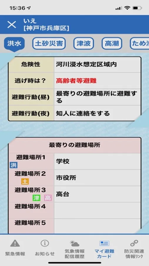 いざというときに、速やかに避難行動がとれるように、学びながら自身で考えた避難行動に移るタイミング(逃げ時)や避難場所を「カード」に保存できます。また、保存した逃げ時に関する情報をプッシュ通知で受け取ると「マイ避難カード」を表示します。