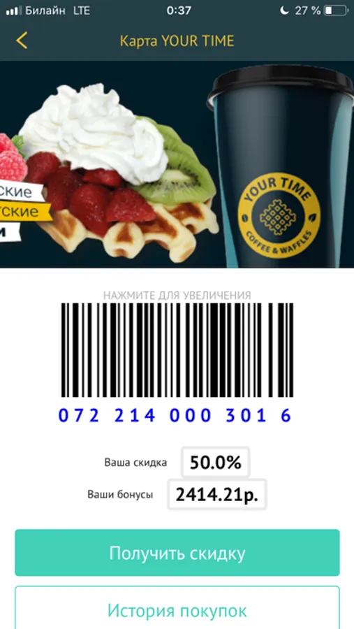 Зарегистрируйтесь в приложении и получите виртуальную карту с 5% скидкой во всех кофейнях YourTime. Считав QR-Код в наших заведениях Вы сможете подключиться к дисконтно-бонусной программе конкретной кофейни.